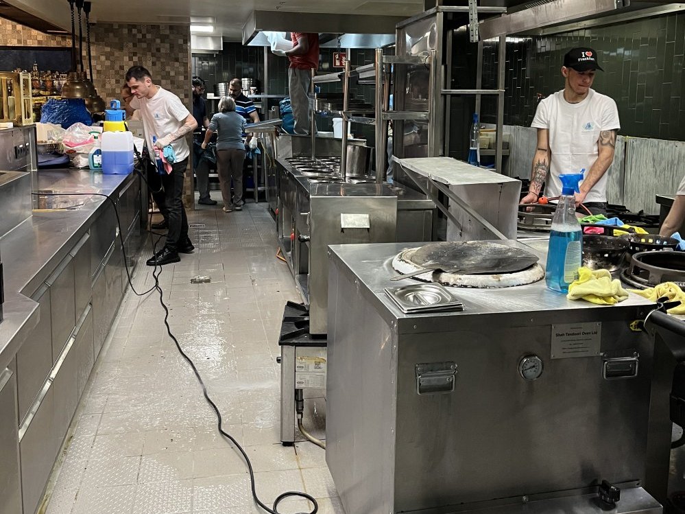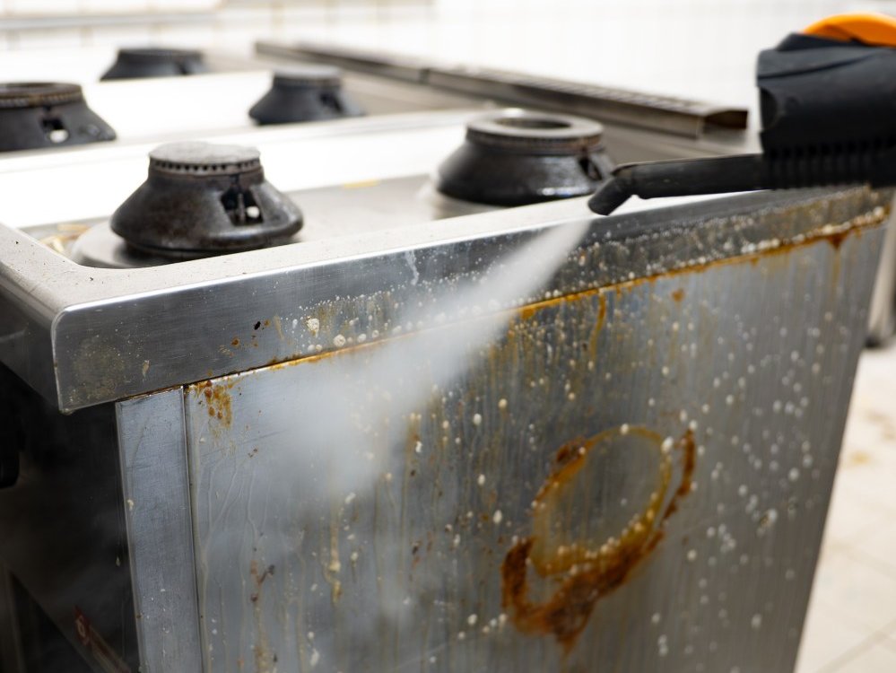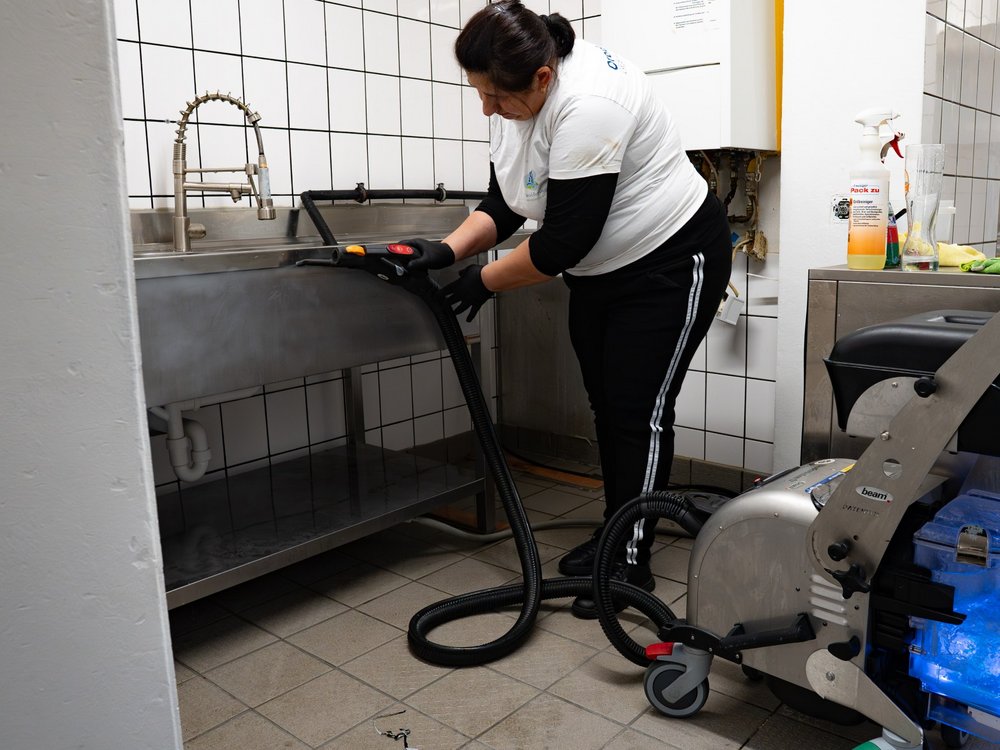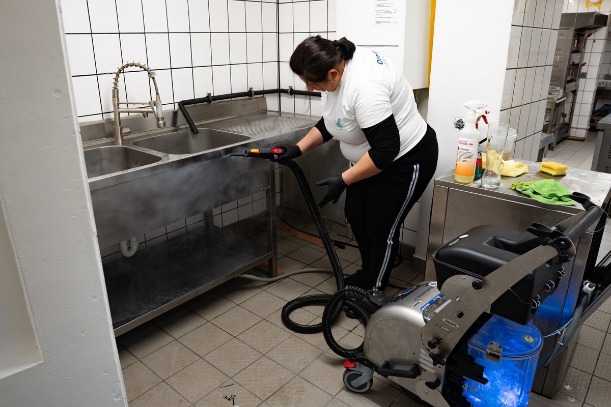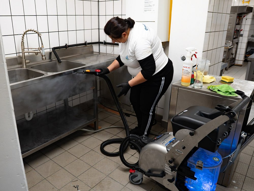 Wir reinigen Küchen gründlich mit leistungsstarken Maschinen und moderner Dampftechnik – von Böden und Wänden bis zu Geräten und Arbeitsflächen.
